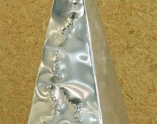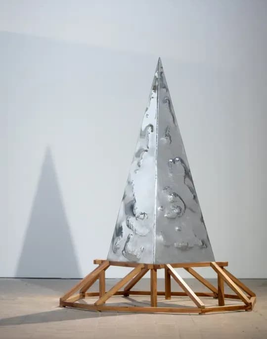 La sculpture How to fix a hole in your roof? est un volume pyramidal en tôles de zinc martelées et soudées à l’étain. Cette pièce repose sur une charpente en hêtre et chêne assemblés sans acier, celle-ci est montée par assemblages et tourillons. Chacune des faces est polies selon un protocole strict faisant entrer en résonance la pièce avec l’espace dans lequel elle est disposée ainsi qu’avec les regardeurs.rices. Usant du vocabulaire de la charpente et de la couverture, How to fix a hole in your roof? est issue de l’extraction d’un élément architectural commun en France et en Belgique, celui de la flèche d’église. Afin de monter le volume, dessiner un arêtier fut nécessaire. Chaque face est martelée selon des techniques de dinanderie offrant une diffraction de l’espace environnant la pièce, accentuée par le polissage. ément architectural commun en France et en Belgique, celui de la flèche d’église. Afin de monter le volume, dessiner un arêtier fut nécessaire. Chaque face est martelée selon des techniques de dinanderie offrant une diffraction de l’espace environnant la pièce, accentuée par le polissage. Extraire un élément d’architecture, la flèche d’église, pour la ramener à échelle humaine donne une accessibilité à cette composante de l’espace urbain qui nous surplombe habituellement.